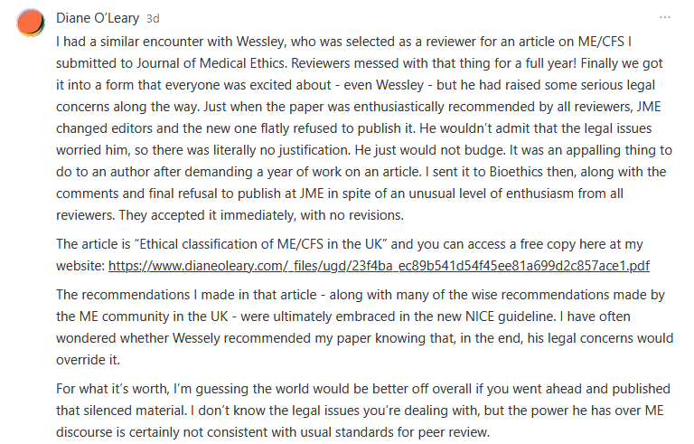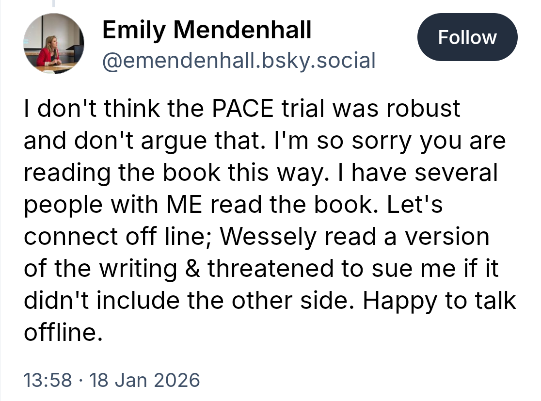 An important juncture occurred in the discussion of Invisible Illness on Bluesky when Mendenhall revealed that Simon Wessely had threatened her with legal action when she was in the prepublication phase of a journal article that referred to him. She elaborated that in Bluesky Blowup that this spilled over to the book, as under pressure she dropped the article and cut significant narrative out of Invisible IlIlness regarding psychiatry, Wessely and PACE.